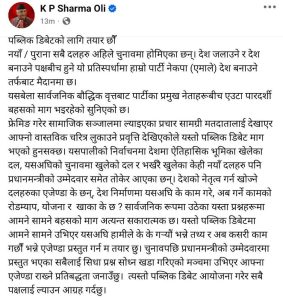ओलीले यसपटकको निर्वाचनमा ऐतिहासिक भूमिका खेलेका दलदेखि नयाँ खुलेका दलसम्म प्रधानमन्त्रीको उम्मेदवार तोकेर मैदानमा आएको उल्लेख गरेका छन्। देशको नेतृत्व गर्न चाहने दलका एजेण्डा के हुन्, विगतमा के काम गरे र अब के गर्ने योजना तथा खाका छन् भन्ने विषयमा आमने–सामने बहसको माग सकारात्मक भएको उनले बताएका छन्।